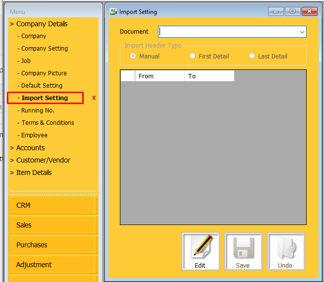 Document Details Import allows you to import an Excel file as the details for a document. the custom function allows you choose an the area where the details are and provides a mapping function for the columns. 1. prepare the document header. select ...