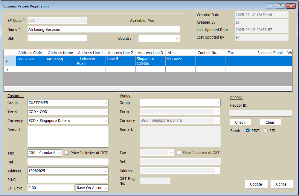 PEPPOL format has require fields. please ensure that the following information is filled in. Business Partner must be selected Address must be selected If you are GST registered, it is required to have a tax code selected additional fields for PEPPOL ...